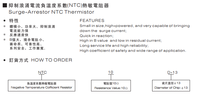 NTC熱敏電阻器:是以錳、鈷、鎳和銅等金屬氧化物為主要材料,采用陶瓷工藝制造而成的。NTC熱敏電阻器在室溫下的變化范圍在10°歐姆~10⒍歐姆,溫度系數(shù)-2%~-6.5%。它具有電阻值隨溫度的上升而下降的特性。適用于轉換電源、開關電源、UPS電源、各類電加熱器、電子節(jié)能燈、電子鎮(zhèn)流器、各種電子裝置電源電路的保護以及彩色顯示管、白熾燈及其他照明燈具的燈絲保護。
