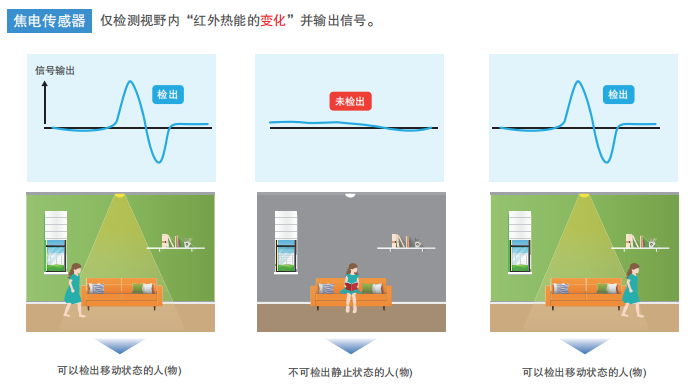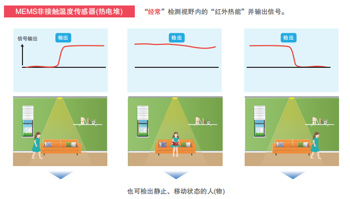 焦電傳感器和MEMS非接觸溫度傳感器都是接收紅外線微弱的熱能并輸出信號的傳感器。焦電傳感器無法檢測靜止狀態(tài)的人(物),而MEMS非接觸溫度傳感器可以檢測靜止狀態(tài)的人(物)。
