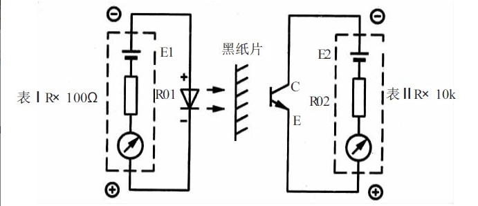 采用“雙表法”檢查光電開關(guān)的電路如圖2 所示。為避免外界光線的影響,應(yīng)盡量在暗處檢測光電開關(guān)。具體方法是:將表Ⅰ撥至R×100 Ω 檔向發(fā)射管提供正向電壓,表Ⅱ置于R×10 kΩ 檔測量c-e 極間電阻。把黑紙片放在發(fā)射窗與接收窗中間,用來阻擋紅外線。上、下抽動紙片時(shí)應(yīng)觀察到表Ⅱ指針有明顯的擺動。在測試條件不變的情況下,指針擺幅愈大,說明器件的靈敏度愈高。
