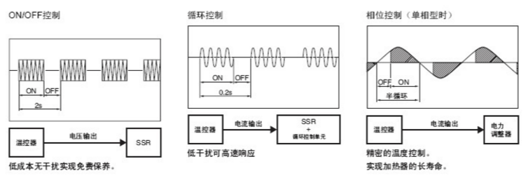 相位控制接受溫控器的電流輸出4~20mA的信號, 使輸出量每半循環(huán)發(fā)生變 化??蛇M行高精度的溫度控制, 多用于半導(dǎo)體制造裝置中。