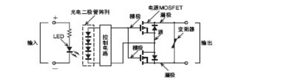 MOS FET繼電器是在輸出元件中使用功率MOS FET的SSR。為使功率MOS FET動作, 光電二極管陣列作為受光元件使用。輸入端子中有電流流過時, LED會發(fā)光。這個光使光電二極管陣列中發(fā)生光電流, 這使柵極電壓使功率MOS FET置于ON。用源共通連接2個功率MOS FET, 可控制AC負(fù)載。DC專用的類型中有帶1個電源 MOS FET的類型。