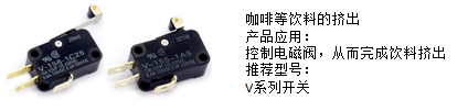 (4)產(chǎn)品推廣四:咖啡等飲料的擠出,推薦使用歐姆龍大容量V系列微動(dòng)開關(guān),用于控制電磁閥,實(shí)現(xiàn)飲料擠出的功能: