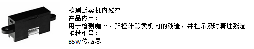 (5)產(chǎn)品推廣五:檢測(cè)販賣機(jī)內(nèi)殘?jiān)扑]使用歐姆龍B5W傳感器,用于檢測(cè)咖啡、鮮橙汁販賣機(jī)內(nèi)的殘?jiān)?,并提示及時(shí)清理殘?jiān)?/span>