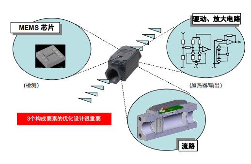 歐姆龍的流量傳感器為氣體專用,可測量各種氣體的質(zhì)量流量。流量傳感器的基本構(gòu)成由測量流量的 MEMS 流量傳感器芯片、放大其輸出的放大電路、以及根據(jù)使用用途經(jīng)CAE(computer-aided engineering)優(yōu)化的流路結(jié)構(gòu)構(gòu)成。由于氣流是矢量流,因此這三個構(gòu)成要素的優(yōu)化設計非常重要。