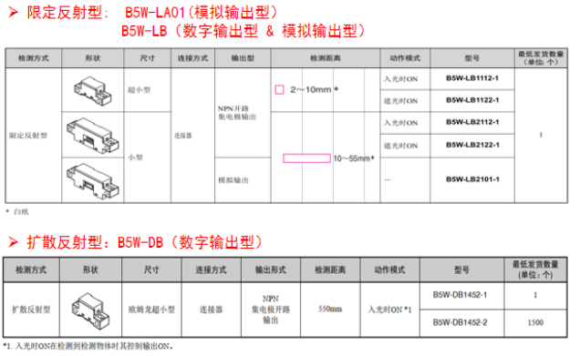 歐姆龍B5W系列傳感器有數(shù)字輸出型和模擬輸出型,,同時根據(jù)不同檢測距離可以適時選擇。