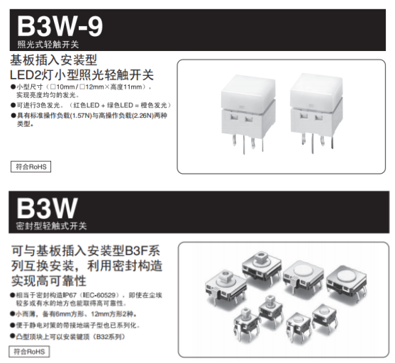 首先來聊聊什么商用飲水機(jī)上可以用我們歐姆龍的哪些產(chǎn)品,這里小編給大家推薦可以應(yīng)用在飲水機(jī)上面歐姆龍的輕觸開關(guān),B3W防水系列和B3W-9帶燈的系列,都可應(yīng)用。