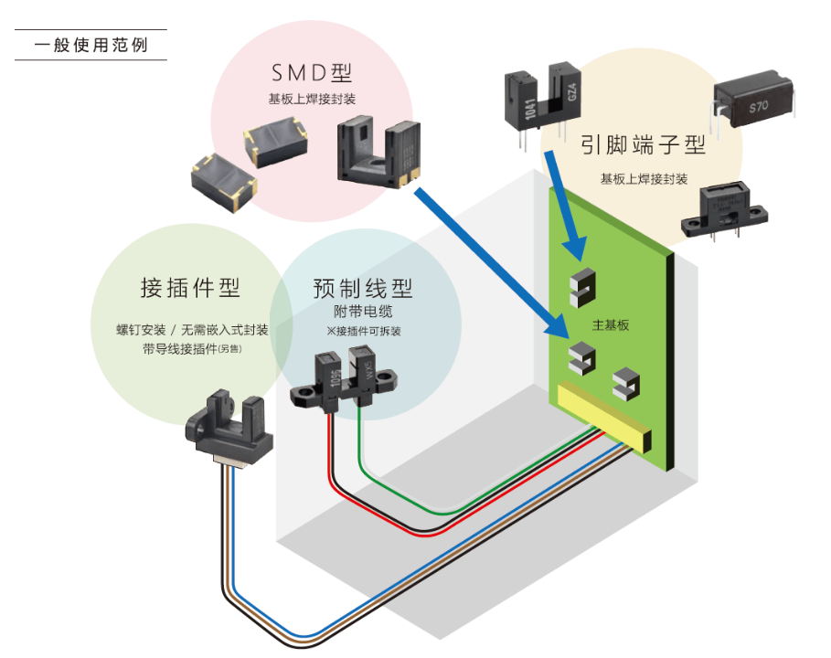 · 請(qǐng)根據(jù)設(shè)備選擇電路板封裝、嵌入、螺釘安裝等的安裝方法。此外,還備有表面封裝、通孔封裝、預(yù)制線連接、連接器連接等各種連接方式。