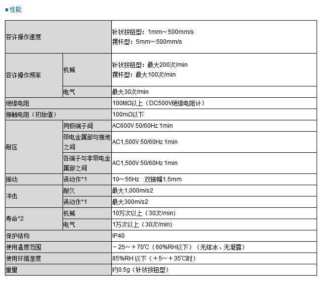 ? ??*1 在針狀按鈕型中為自由位置和動(dòng)作極限位置的值,在擺桿型中為動(dòng)作極限位置的值。接點(diǎn)的閉路或開(kāi)路動(dòng)作小于1ms。