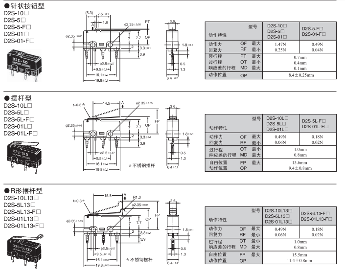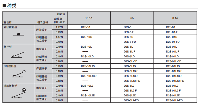 具有較好的耐焊劑性的超小型系列 焊劑無(wú)法進(jìn)入的一體成型端子結(jié)構(gòu)。 動(dòng)作位置(OP)的精度高達(dá)±0.25mm,周邊設(shè)計(jì)和定位簡(jiǎn)單。 采用了橫向操作中也能方便動(dòng)作的針狀按鈕型。