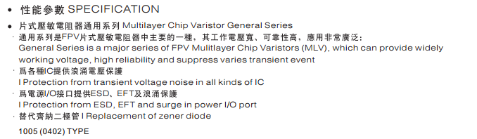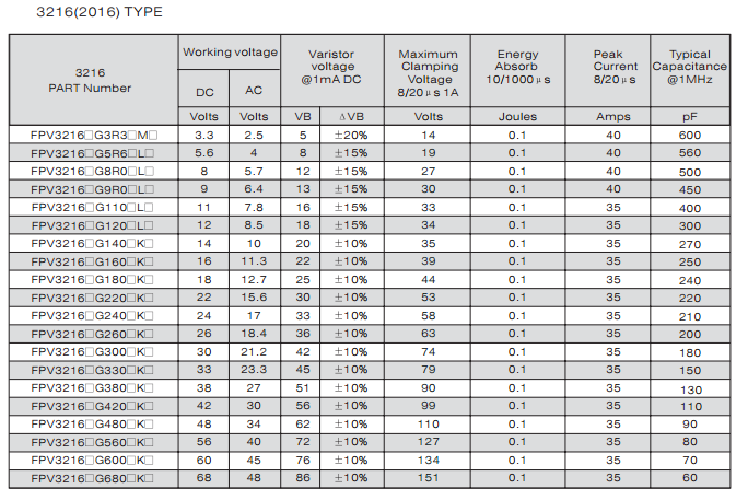 特征: 1、疊層片式陶瓷結(jié)構(gòu)。 2、無(wú)引線。 3、溫度范圍:-55℃~+125 ℃。 4、工作電壓范圍V w(dc)=3.3~ 615V。 5、具有雙向限制特性,適合ESD保護(hù)。 6、漏電流非常小。 7、寄生電感小、響應(yīng)速度快(響應(yīng)時(shí)間少于0.5ns)。 8、優(yōu)良的溫度系數(shù)。 9、良好的焊接性能(端電極為三層電鍍)。 應(yīng)用: 1、防止過(guò)電壓:當(dāng)施加的電壓升高到壓敏電壓時(shí),壓敏電阻器的電流急劇上升,被保護(hù)設(shè)備的浪涌電壓迅速減小,從而使裝有壓敏電阻器的設(shè)備抗浪涌噪聲能力達(dá)到相應(yīng)要求。壓敏